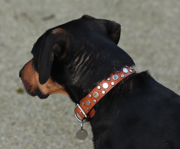 En cuir couleur naturel feu, rehaussé de nombreux clous argentés, c’est à Bellême, chez la "Broc’Hanteuse" Cricri que nous avons trouvé ce magnifique collier.