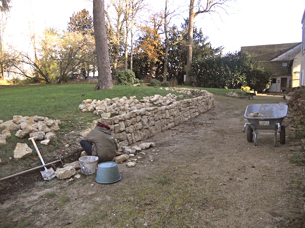 Not exactly the Great Wall of China, nor even Hadrien’s Wall, still less the Lion Gate of Mycenae, but the building technique is time-honoured… worked at over a period of several months, the stones hand-tooled when they don’t fit first time, it’s basically a dry-stone wall (with the occasional assist from a bucket of mortar). We call it the Ammonite Wall after the many fossils we found when selecting our stones: the Perche is particularly rich in fossils some of which are prominently placed in the finished construction. Our guests are always welcome to lend a hand, but, strangely enough, the prospect of lugging around boulders and buckets of mortar in this winter’s driving rain hasn’t attracted many volunteers!